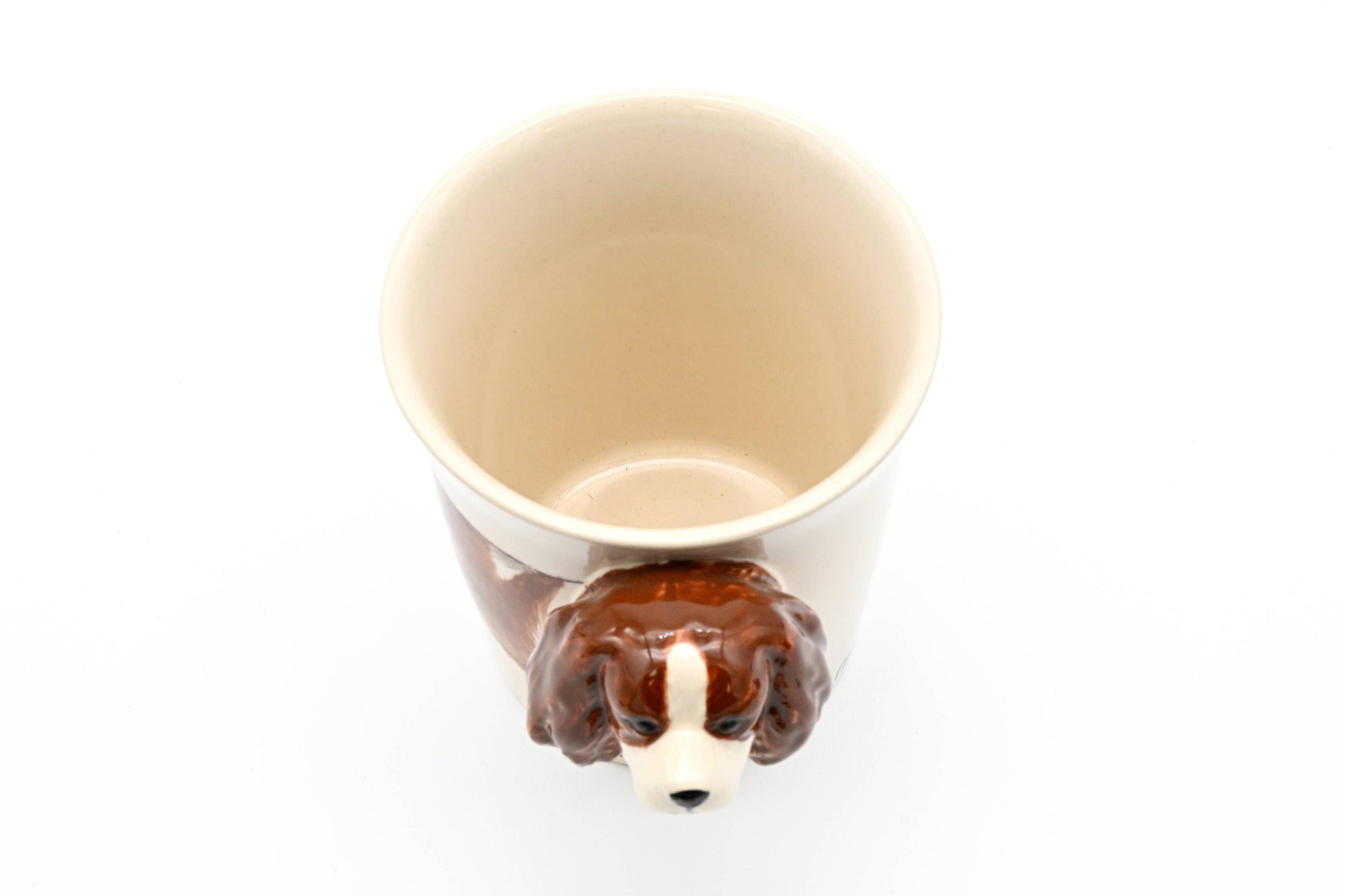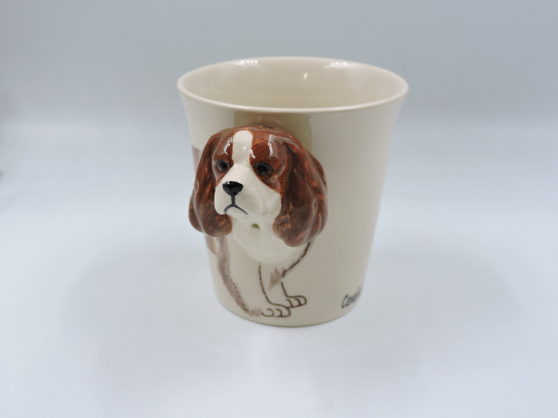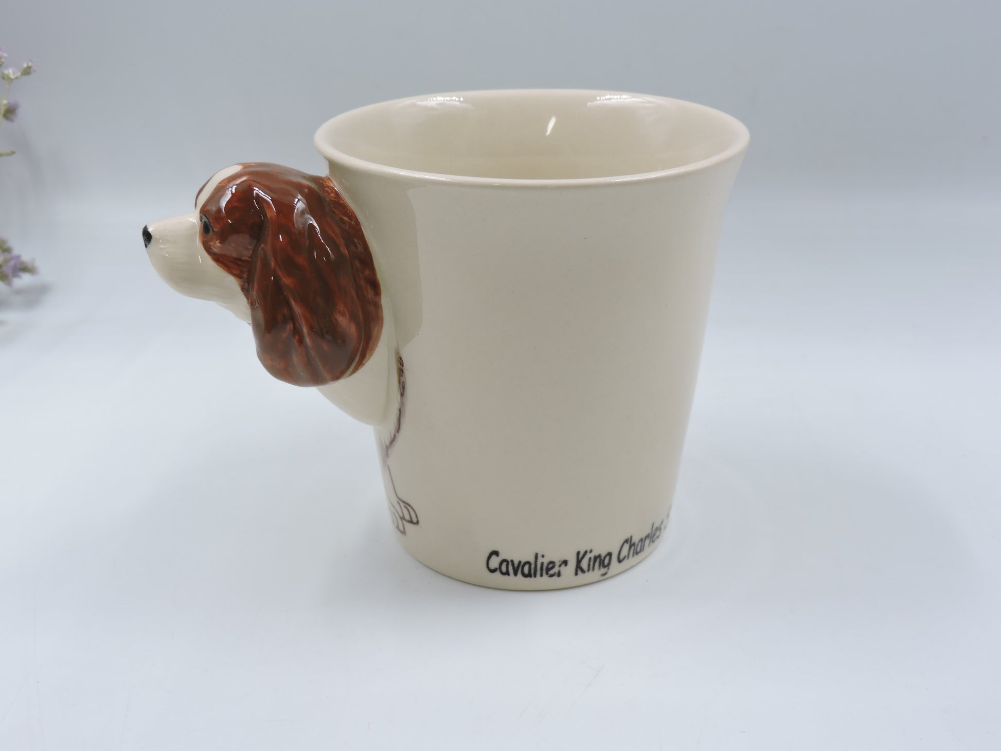 Elegant and whimsical, this 10 oz ceramic mug features a hand-painted Cavalier King Charles Spaniel motif—complete with a sculpted dog-head handle that adds character to every sip. The glossy finish highlights the intricate detail of the portrait, making it a delightful conversation piece in any kitchen.